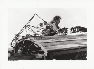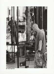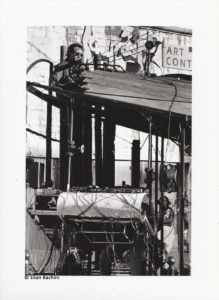 Mékimanipulki est une machine à faire du son, du rien, du “flan”, une machine à brasser l’air. Accessoirement il en sortira – après plusieurs heures de montage, réglage, synchronisation – une pièce sonore, improbable fleur métallique, sortie désenchantée de la feraille et des cadences de l’atelier. Les deux opérateurs, en bleu de travail, se démènent le plus sérieusement du monde, devant le regard perplexe des badaudsqui, petit à petit, se piquent au jeu de savoir qui fait quoi (ou plutôt quoi fait quoi) dans ce capharnaüm de bidules et d’automates.