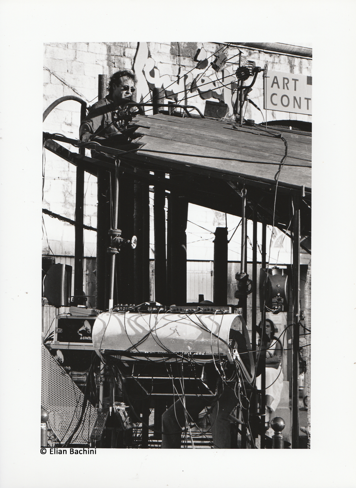 Mékimanipulki est une machine à faire du son, du rien, du “flan”, une machine à brasser l’air. Accessoirement il en sortira – après plusieurs heures de montage, réglage, synchronisation – une pièce sonore, improbable fleur métallique, sortie désenchantée de la feraille et des cadences de l’atelier. Les deux opérateurs, en bleu de travail, se démènent le plus sérieusement du monde, devant le regard perplexe des badaudsqui, petit à petit, se piquent au jeu de savoir qui fait quoi (ou plutôt quoi fait quoi) dans ce capharnaüm de bidules et d’automates.